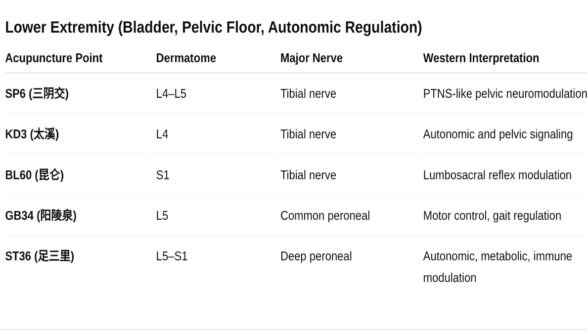 SP6, KD3, BL28 → tibial & sacral nerve modulation